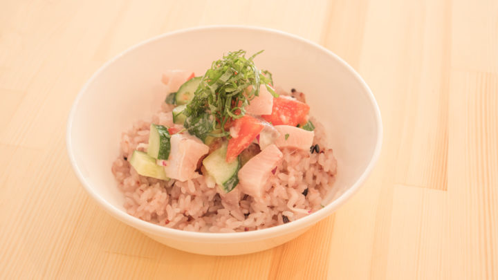 はちみつを使って作るドレッシングを、お魚、古代米、お野菜を合わせた爽やかサラダ丼です!爽やかで優しい味わいで、夏の暑さも忘れられます。