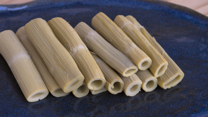 鍋にお湯を沸騰させ、皮を剥いたイタドリを20秒~30秒ほどサッと湯がき、その後冷水に浸ける
