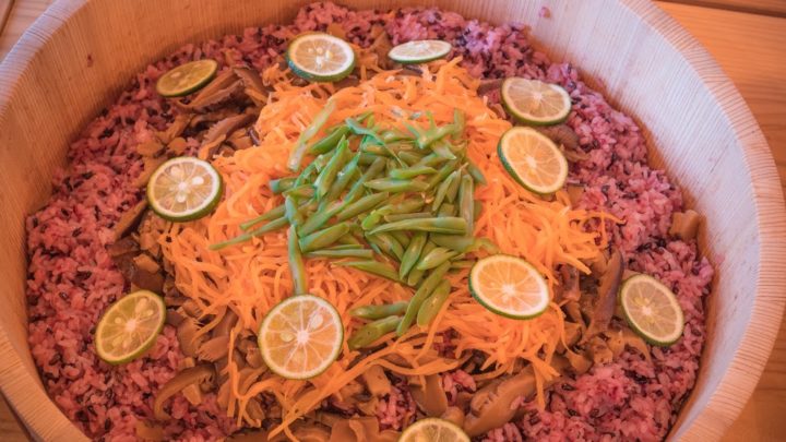 米が炊けたら寿司桶に移し、☆寿司酢を加えながら切る様に混ぜる。