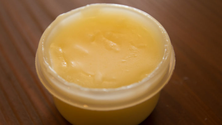 全部解けたら、容器を湯煎から外します。周りから徐々に固まりだし黄色からクリーム色に変わります。