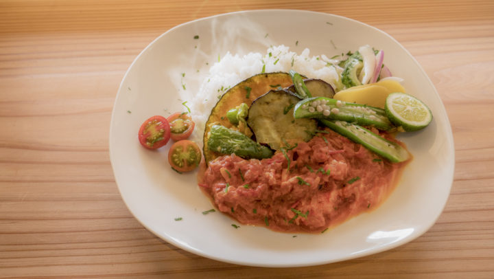 カレー粉と玉ねぎをベースにトマトでコクをだしたカレーソース。たっぷりの野菜のトッピングとともに、ぜひ、すだちをしぼってお召し上がりください。