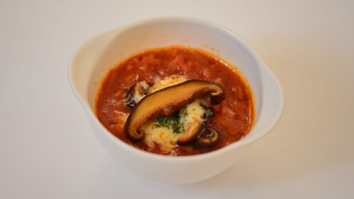 佐那河内村の名産のひとつ、しいたけを赤かぶ、鶏肉と煮込んだトマトスープです。しいたけのダシが食材の旨味を引き出します。
