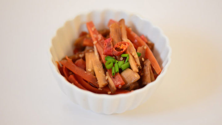 佐那河内村の有名な産品であるしいたけの軸を使ったきんぴらです。こりこりと良い歯ごたえと、しいたけの風味がたまらない一品です。