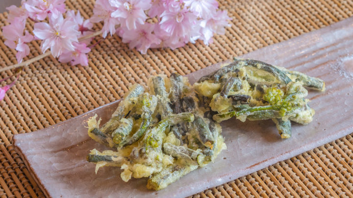 天ぷら鍋に油を入れ、180度になったらお玉で適量のワラビをすくい、そっと鍋に入れる